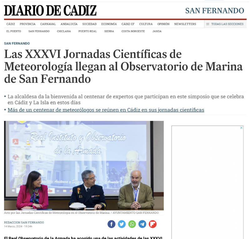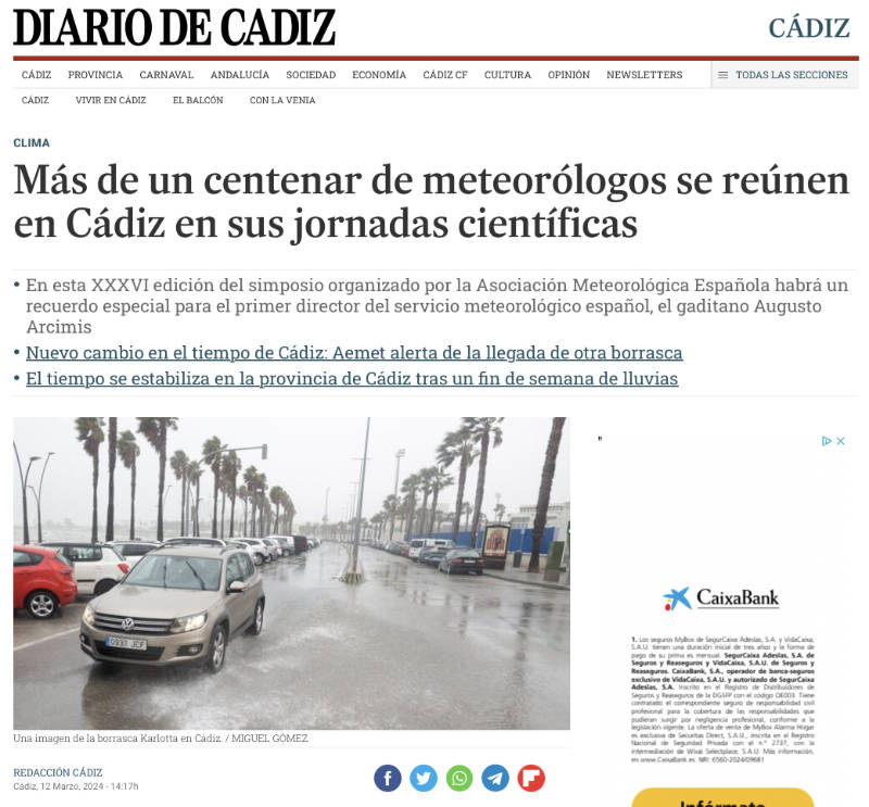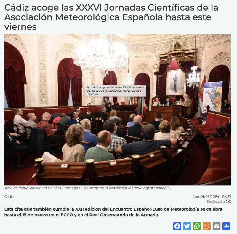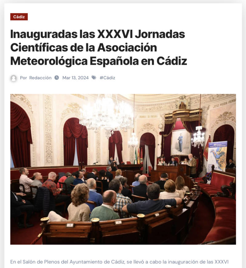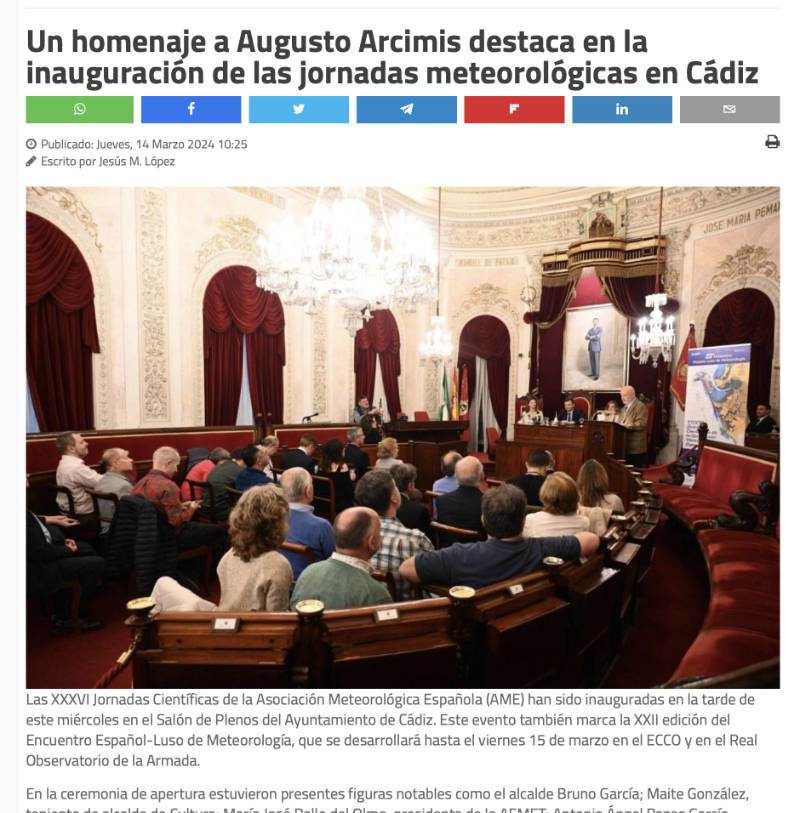 Notas de Prensa Cádiz NoticiasInauguradas las XXXVI Jornadas Científicas de la Asociación Meteorológica Española en Cádiz Onda Cádiz RTVCádiz acoge las XXXVI Jornadas Científicas de la Asociación Meteorológica Española hasta este viernes Diario de CádizMás de un centenar de meteorólogos se reúnen en Cádiz en sus jornadas científicas Portal de CádizUn homenaje a Augusto Arcimis destaca en la inauguración de las jornadas meteorológicas en Cádiz Diario de CádizLas XXXVI Jornadas Científicas de Meteorología llegan al Observatorio de Marina de San Fernando